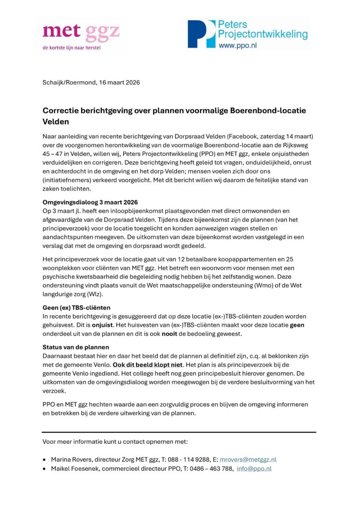 De Dorpsraad Velden biedt de initiatiefnemer Peters Projectontwikkeling en zorgorganisatie ‘MET ggz’ haar verontschuldigingen aan voor de incorrecte aanduiding. Het voornemen is om zorg en huisvesting te bieden aan mensen met een psychische kwetsbaarheid die begeleiding nodig hebben bij het zelfstandig wonen.